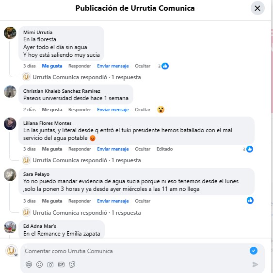 Las quejas reflejan un malestar generalizado entre usuarios, quienes aseguran que la falta de agua o su mala calidad afecta la vida cotidiana, especialmente para quienes trabajan fuera de casa y dependen de horarios regulares para realizar labores domésticas. Hasta el momento, no se ha informado públicamente una explicación puntual sobre las causas de estas fallas.