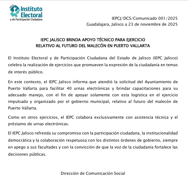 Puerto Vallarta, Jal.- La consulta realizada en Puerto Vallarta los días 21, 22 y 23 de noviembre del 2025 para conocer la opinión ciudadana sobre la posible apertura o no del malecón a la circulación vehicular no contó con supervisión del Instituto Electoral y de Participación Ciudadana de Jalisco (IEPC). El organismo confirmó que su participación se limitó al préstamo de 40 urnas electrónicas y a una capacitación básica sobre su operación, sin intervenir en la organización, el seguimiento ni la validación del ejercicio.