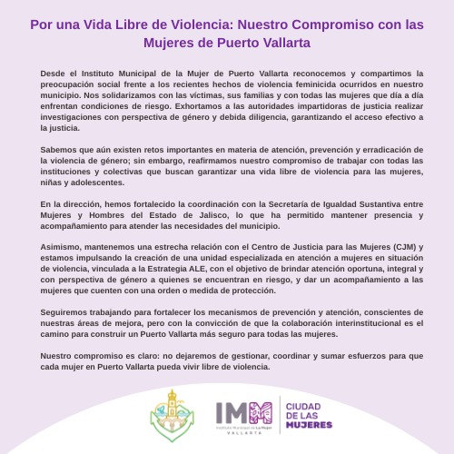 A través del comunicado titulado “Por una Vida Libre de Violencia: Nuestro Compromiso con las Mujeres de Puerto Vallarta”, la dependencia que dirige Sarahy Hernández reconoció la preocupación social que han generado los casos recientes y expresó su solidaridad con las víctimas, sus familias y con todas las mujeres que enfrentan situaciones de riesgo.