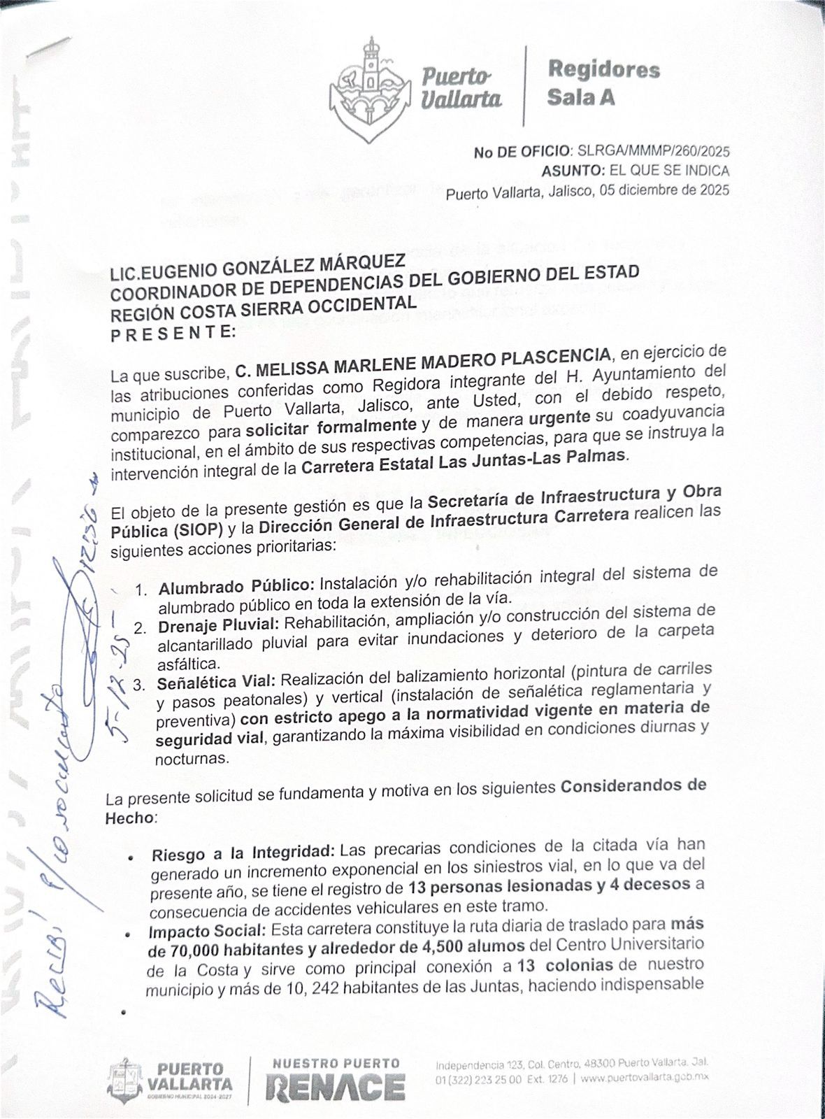 Puerto Vallarta, Jal.— La regidora Melissa Marlene Madero Plascencia pidió de manera formal la intervención urgente del tramo Las Juntas–Las Palmas de la carretera estatal 544, al entregar un oficio dirigido al coordinador regional del Gobierno de Jalisco, Eugenio González Márquez. La solicitud se suma al punto de acuerdo que la edil presentó previamente en Cabildo, en el que expuso la gravedad de la situación que enfrenta esta vialidad.
