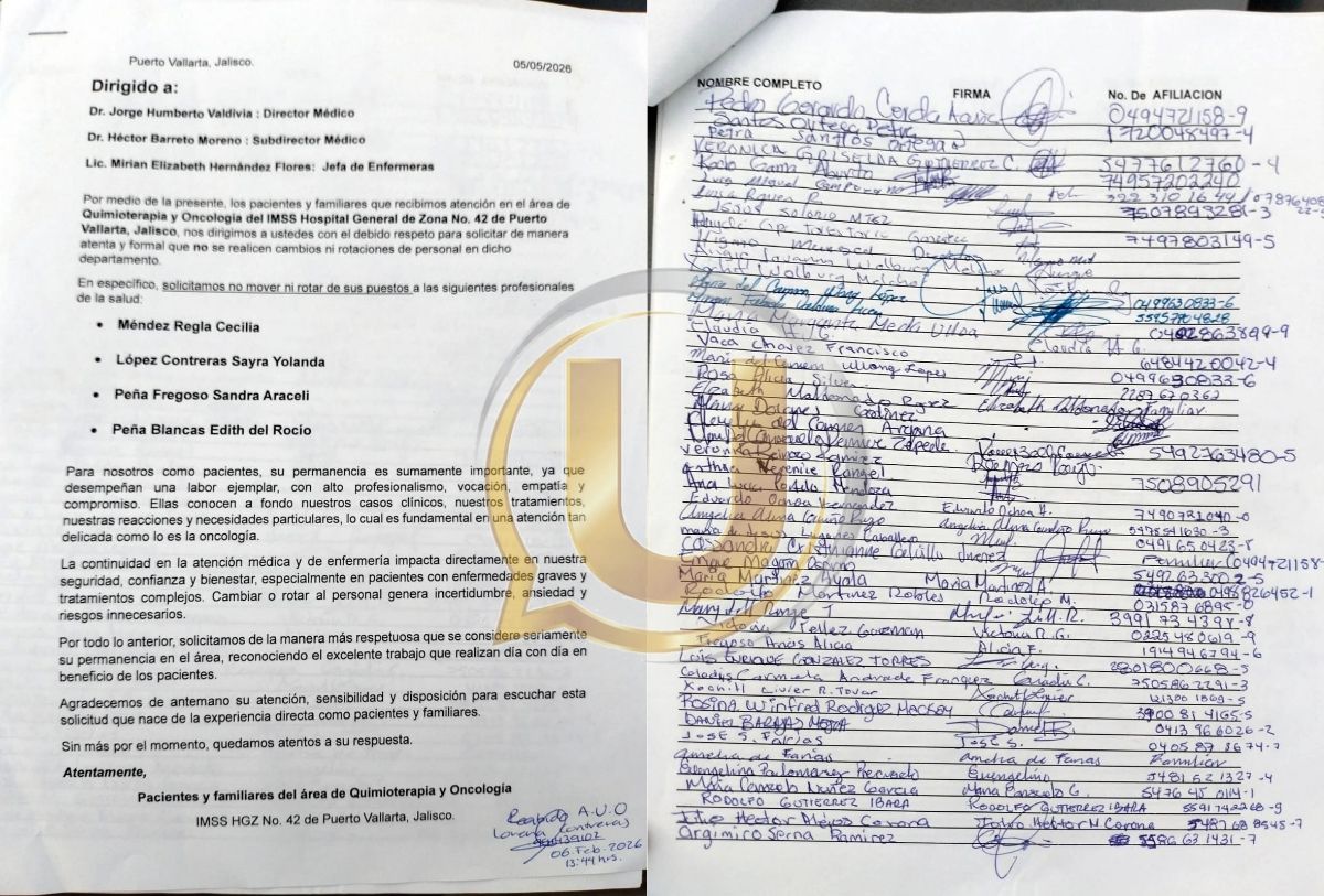 Puerto Vallarta, Jal.- Este martes 17 de febrero de 2026 llegó a la redacción de Urrutia Comunica una queja atribuida a pacientes del área de oncología del Hospital General de Zona No. 42 del Instituto Mexicano del Seguro Social en Puerto Vallarta. De acuerdo con el reporte, un grupo de usuarios en tratamiento de quimioterapia habría enviado un oficio para solicitar que las enfermeras de esa área no sean reasignadas a otros departamentos.