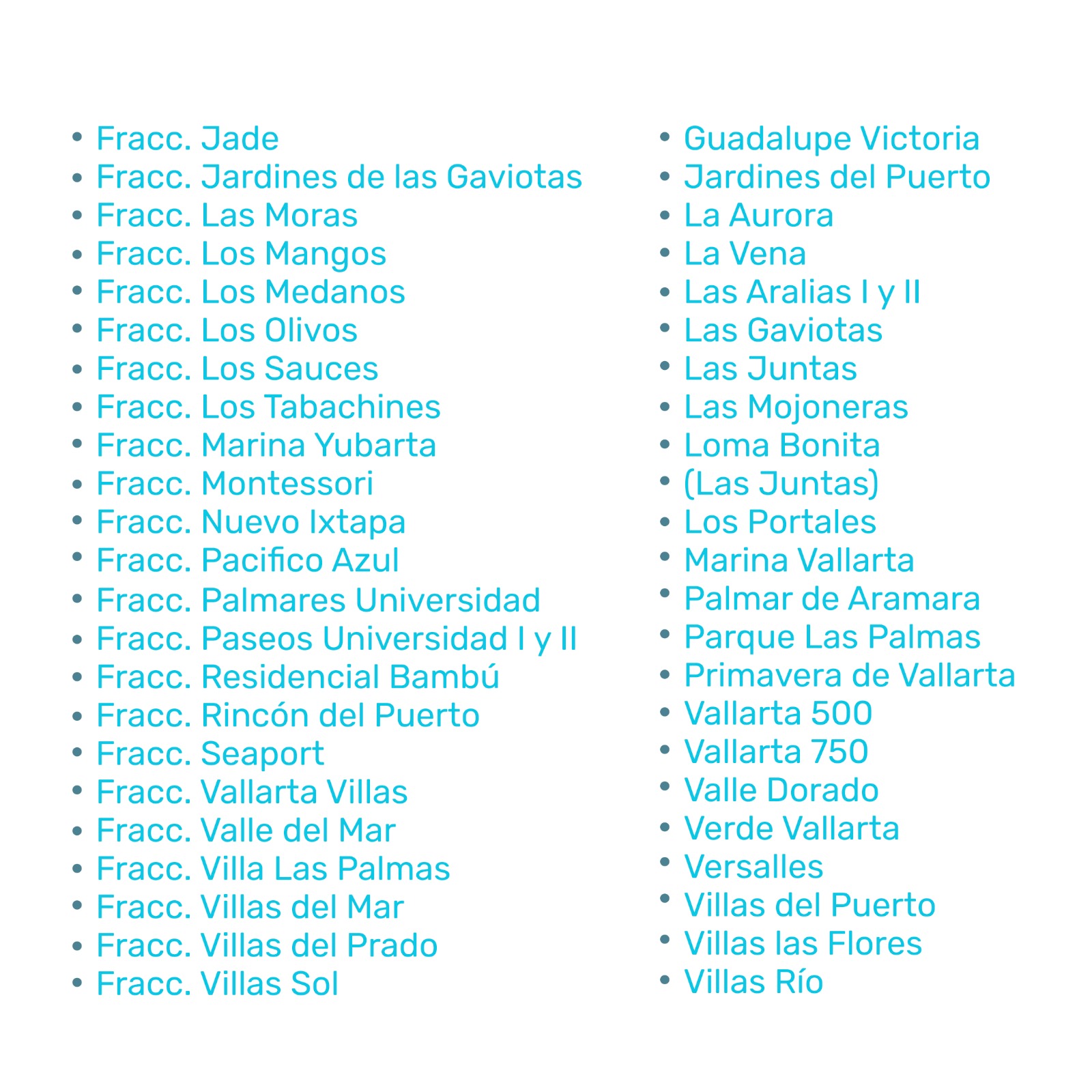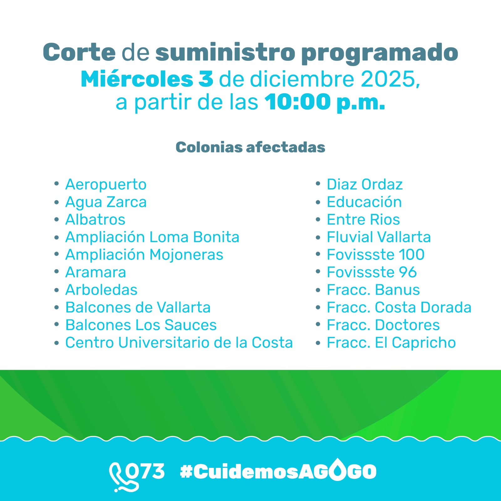 Lo anterior ocasionará baja presión o falta de agua en más de 60 colonias de la zona norte de la ciudad, principalmente en Las Juntas, Ixtapa, Las Mojoneras, franja hotelera, colonias cercanas al aeropuerto, zona de Versalles, Los Sauces y Fluvial Vallarta, entre otras, esto a partir de las 10:00 de la noche del miércoles 3 de diciembre a las 3:00 de la tarde del día siguiente.