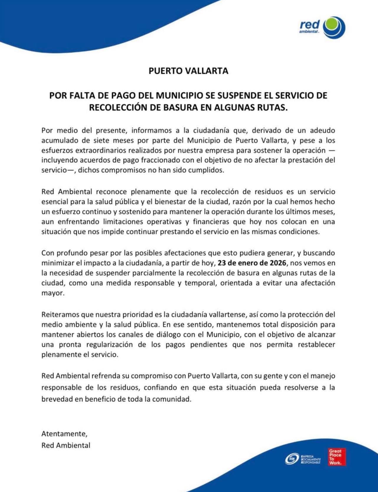 Puerto Vallarta, Jal.- A partir de este viernes 23 de enero de 2026, la empresa Red Ambiental inició un paro parcial en el servicio de recolección de basura en distintas zonas de Puerto Vallarta, como consecuencia de un adeudo millonario de más de 160 millones de pesos que, según la compañía, mantiene el Ayuntamiento desde hace siete meses.
