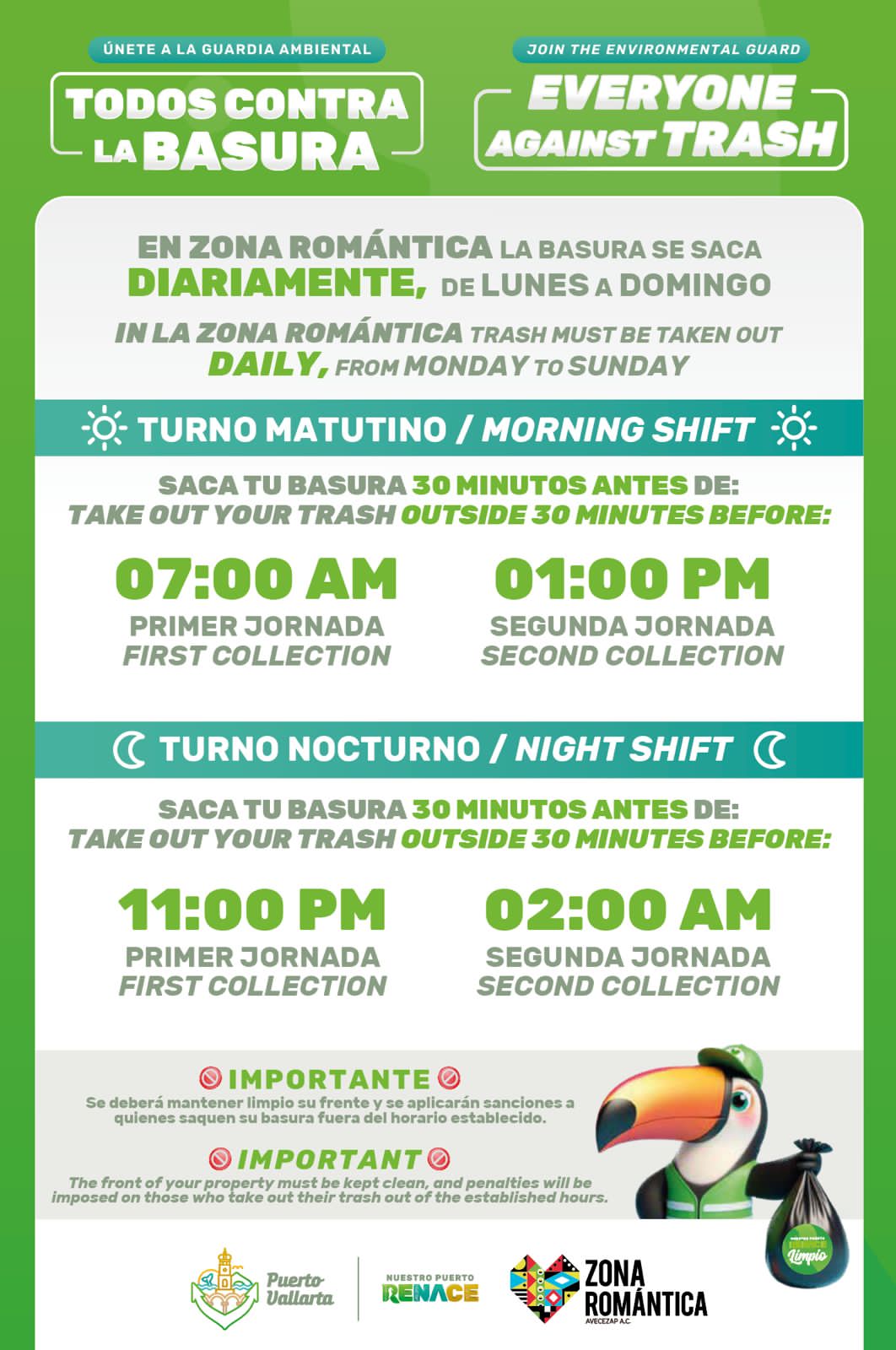 -Ante el aumento de actividad turística en temporada alta, el Gobierno Municipal de Puerto Vallarta solicitó a residentes y empresarios de la Zona Romántica ajustarse a los horarios de recolección para evitar acumulación de residuos y sanciones
