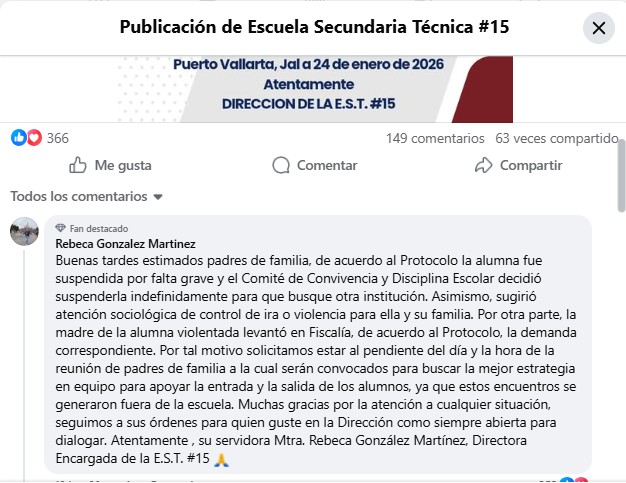 Posteriormente, la directora encargada del plantel, Rebeca González Martínez, complementó la información al detallar que la alumna señalada como agresora fue suspendida por incurrir en una falta grave. Explicó que el Comité de Convivencia y Disciplina Escolar determinó su suspensión indefinida, con la recomendación de que continúe sus estudios en otra institución.